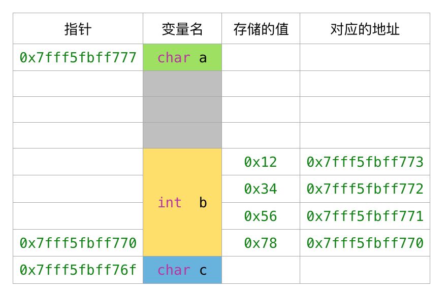 灰色表填充用来对齐,保证最后结构体大小是最长的成员的大小的整数倍。