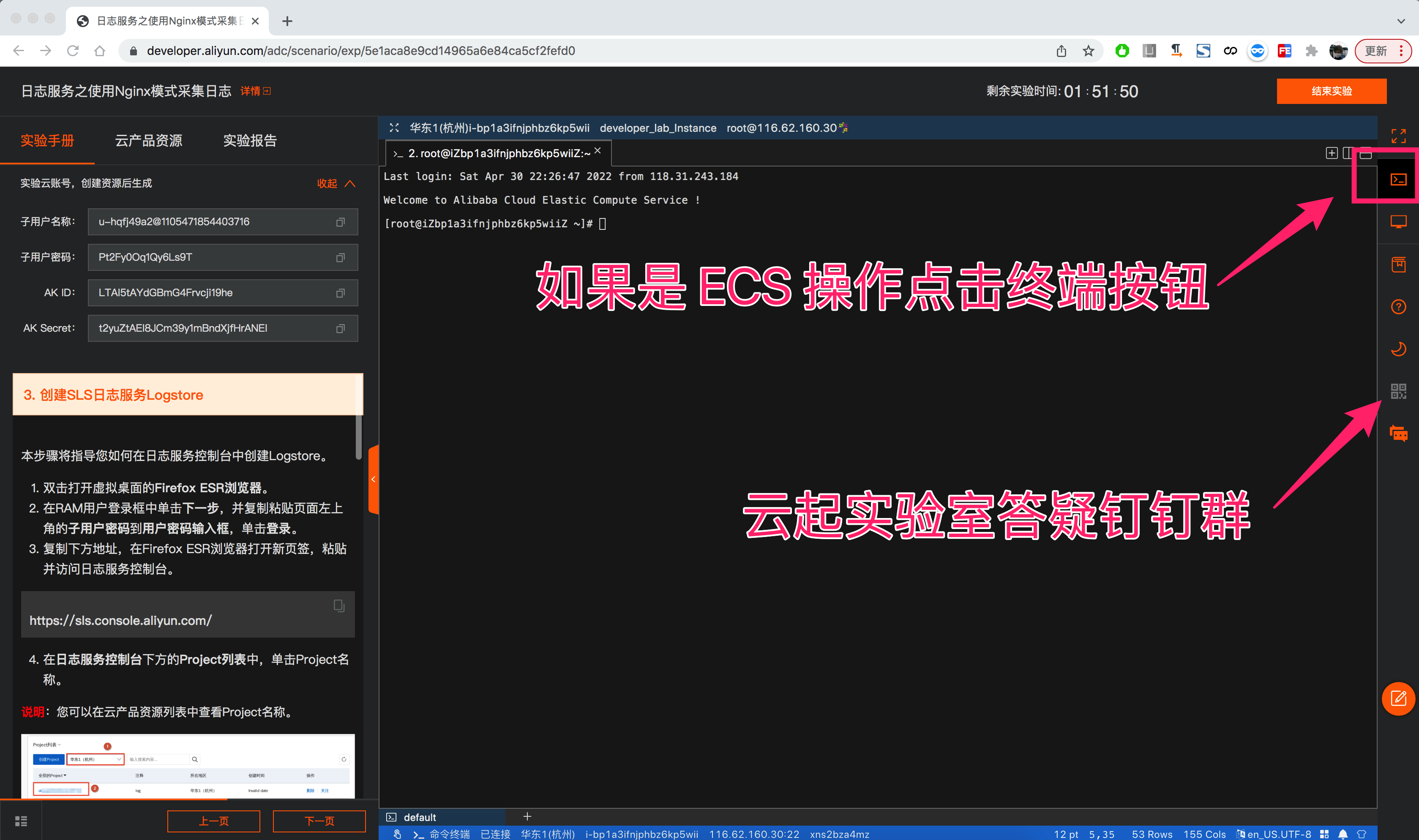 点击创建资源,然后系统会根据后台的配置,首先分配一个子账号,然后在这个子账号下面分配云资源,比如这个场景,采集 nginx 日志到 sls ,所以会分配一台 ecs 并且开通 sls 服务。